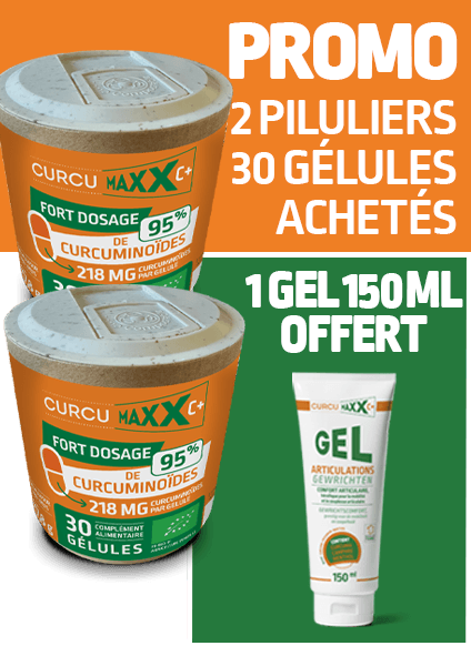 • curcuma longa* (hors UE) : 230 mg dont curcuminoïdes (95 %) : 218,5 mg, dont 152 mg de curcumine, extrait sec d’ortie* picante (urtica dioica) : 159 mg,